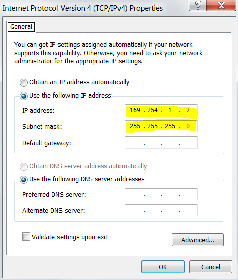 *Set static IP address 169.254.1.2 on your PC | *Set static IP address 169.254.1.2 on your PC | ||
