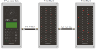 The IP DAK-48 unit expands the IP Flush Master station with an additional 48 Direct Access Keys. Up to two DAK-48 units can be connected to one station. To interconnect the DAK-48 unit to the main unit, use the cable which is coming with the DAK-48 unit. The DAK-48 unit receive its power and data via this cable.