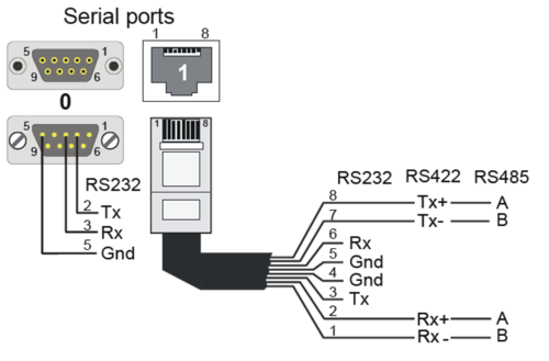 - Serial Port 1: RS232, RS422 or RS485 on an RJ45 connector