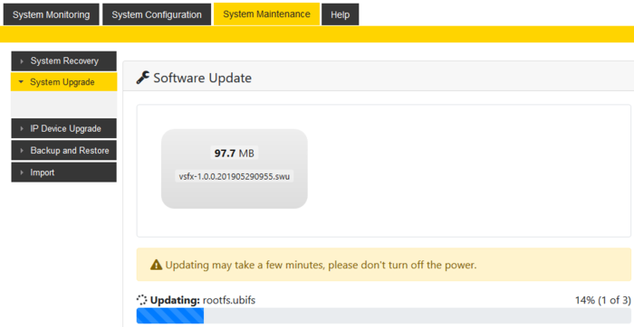 [[File:ICX500 Sw UpgradeProgress.PNG|left|thumb|700px|Software Upgrade status in the browser]] | [[File:ICX500 Sw UpgradeProgress.PNG|left|thumb|700px|Software Upgrade status in the browser]] | ||