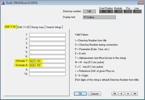 If the hotline call should generate a Call Request instead, enter "I 623 I xxx" on DAK 7, where xxx is the target station. | Option: If the hotline call should generate a Call Request instead, enter "I 623 I xxx" on DAK 7, where xxx is the target station. | ||