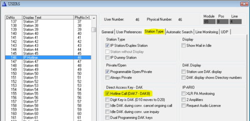 Enable the hotline function by selecting the hotline station in the listbox in '''Users & Stations''', select the '''Station Type''' tab, and check the '''Hotline''' flag: | |||