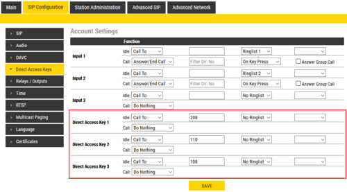 - Select SIP Configuration > Direct Access Key Settings, and enter the call destination on Input 3: