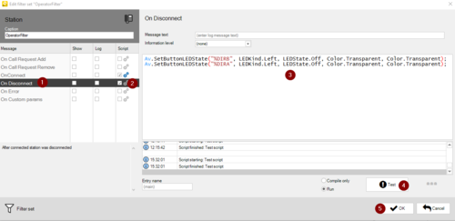 - Select Test (4), then OK (5) to save. (Note that if pressing "OK" without having done "Test" first, the script will not be saved!).