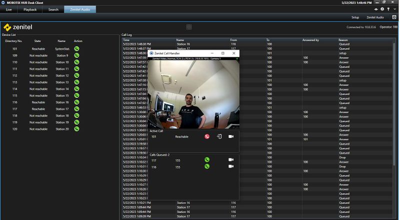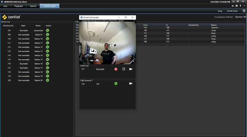 * The popup window displays the active call (if it was initiated by the operator) or a list of queued calls, along with a video preview from an associated camera. | * The popup window displays the active call (if it was initiated by the operator) or a list of queued calls, along with a video preview from an associated camera. | ||