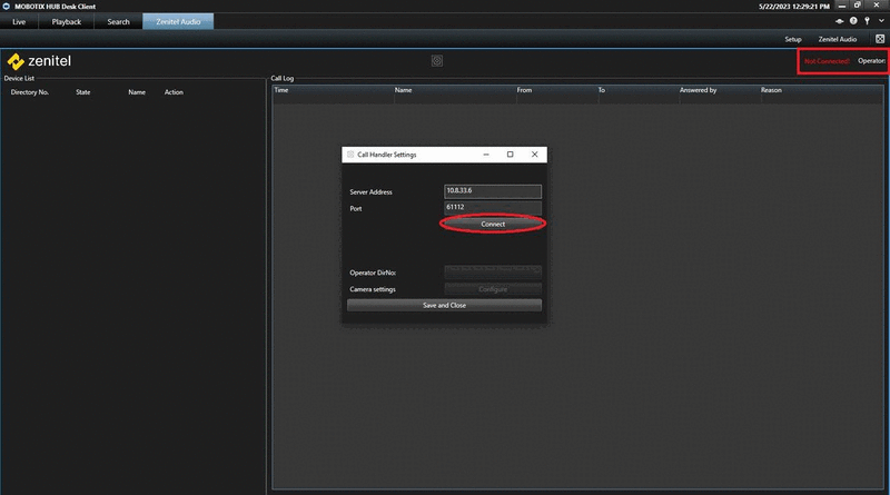 In the MOBOTIX HUB client on the Zenitel Audio tab select a device you wish to call and click on the green "Answer/Call" button.