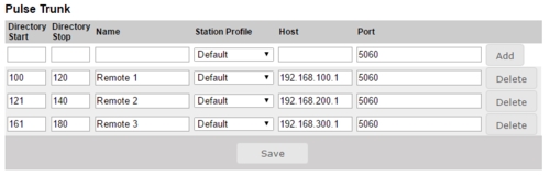 Pulse Trunking is a feature in the Pulse Server for enabling calls between different Pulse sites. The function is enabled with Pulse-Server-Enterprise license. A total of 50 trunk routes can be configured on the Pulse server.