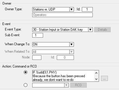 IF %udd(%1.PHY) !Because the button has been pressed already, we dont want to re-do STOP ENDIF $GRM L%1.DIR L85 U0 !Remote this master from the group WUDD 553 %op(%udd(553),+,1) !Add 1 to the current value of UDD 553 $DTS L%1.DIR 'Remote mode' !Write something to the display WUDD %1.PHY 1 !Set the flag that the button has been pressed IF %op(%udd(553),==,4) !Because 4 Masters are now in remote mode $SCRT L105 L107 !Transfer the call request from the dummy number to the MCR number ENDIF