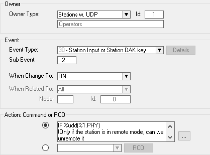 IF %udd(%1.PHY) !Only if the station is in remote mode, can we unremote it $GRM L%1.DIR L85 U1 !Put the station back in the group WUDD 553 %op(%udd(553),-,1) !Subtract 1 from the current value of UDD 553 WUDD %1.PHY 0 !Unset the flag so the button can be pressed again $DTS L%1.DIR 'Local Mode' !Write something to the display IF %op(%udd(553),<,4) !Now that UDD 553 is less than 4 $SCRT L105 !Turn off Call Request Transfer at the dummy ENDIF ENDIF
