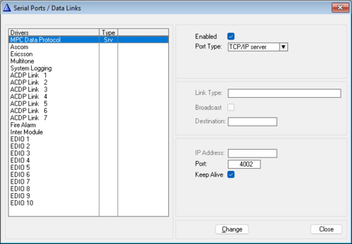 The settings above is used when the system connects to the SMS Software over a LAN. In this example TCP port number 4002 is used. Make a note of this number; you will need to enter it into the LAN Chain setup of the SMS software.