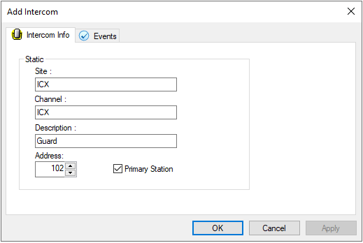 Enter the description for the intercom and in Address field enter the Directory number assigned to that intercom in the ICX-Alphacom If the intercom is to be a primary station, enable the primary station check box and click OK. In order for an intercom to be assigned to a workstation, the Primary station checkbox must be enabled. When an intercom is assigned to a workstation, that intercom allows a dispatcher to communicate with an individual at an access point.