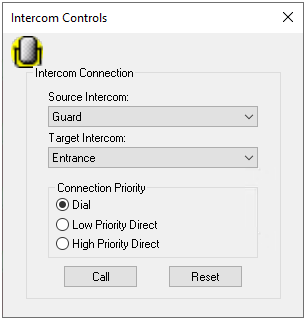 The Intercom Controls dialog box allows you to define a source and target intercom and initiate a connection between the two. Intercom controls also allow you to assign a connection priority.