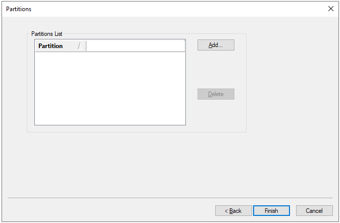 - In the IP address field, enter the IP address of the ICX-Alphacom and the TCP port defined in the web interface in the next field. Click Next to display the Partitions dialog box.