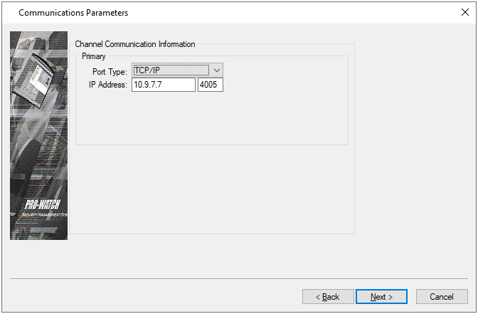 - Click Next to display the Communications Parameters dialog box.