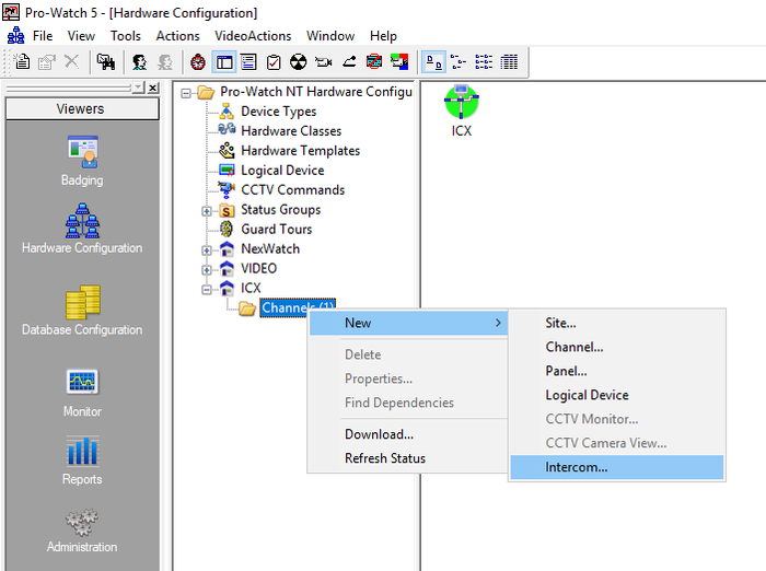 To add the intercoms in the system, in the hardware configuration tree view, right-click on the created channel