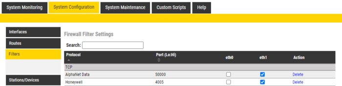 If the port is not in the list yet, use Add Filter to define it. In the above screenshot, it has been defined with the name Honeywell but any meaningful name can be given. Enable this TCP port on the relevant Ethernet port (Eth0 or Eth1).