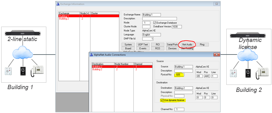 When using AlphaNet Static License, one have to configure fixed Audio Connections between the AlphaCom servers. This is done from AlphaPro, Exchange & System > NetAudio, where you specify that a VoIP channel in the "Source" exchange has a static (fixed) connection to a VoIP channel in the "Destination" exchange.