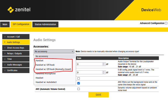 - When "Accessory" is set to "Handset" the station is by default in loudspeaking mode, i.e. the audio is routed to the speaker and microphone of the front panel of the TFIE station. Audio is also routed to the handset speaker, but the handset microphone is disabled.