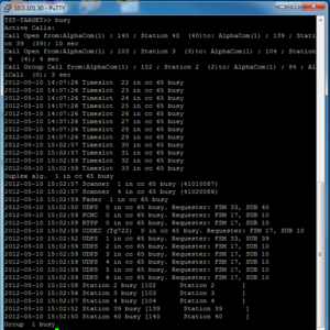 Active conversations Timeslots - Backplane timeslots, of which there are 256 Faders - Used by the group call and simplex conference features. 2 faders per ASLT, 4 faders per ATLB-12, 12 faders on the AMC-IP. Scanners - Used in voice switched conversations. 2 scanners per conversation. Two scanners on each ASLT/ATLB. Duplex algoritms - Software resource. One (of 250) per voice switched conversation. Stations - Stations currently busy Group - Groups currently busy UDPS - VoIP channel. Every IP device (IP station, SIP phone, AlphaNet, etc.) which is sending or receiving audio is using one (of 64) VoIP channel. PCMC - PCMC channels are audio links betweeen the backplane (i.e. analog ASLT/ATLB users) and VoIP channels on the AMC-IP. There are 32 PCMC channels. CODEC - Used when transcoding between different codecs, eg. from G711 to G722. Codec is also used between PCMC and RTPP, i.e. from backplane to VoIP. 32 codecs available. RTPP - "RTP Packetizer". Makes “Real-time Transport Protocol” packets after the codec has converted PCM audio to G7xx.