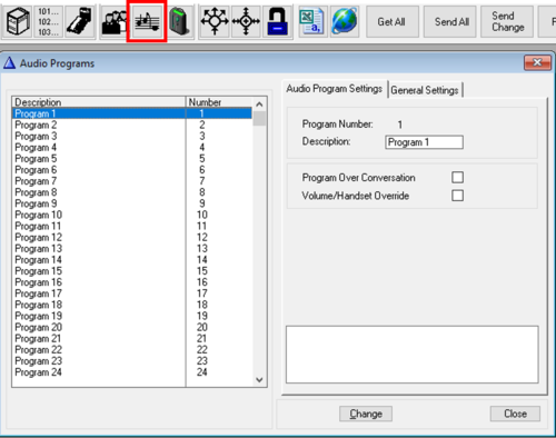 File:AlphaPro Audio Program General window.png|Audio Programs > General Settings '''Change''' mode