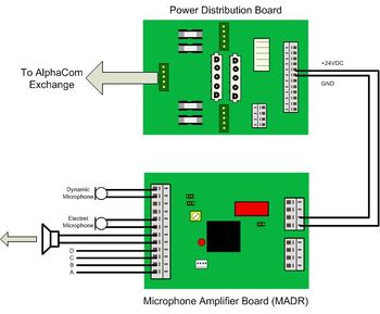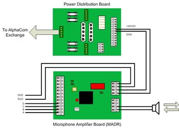 It is possible to place the MADR board on one of the mounting rails in the connection field of the exchange. Then you must run a screened cable from the microphone to the MADR board and run the GND wire to exchange GND on the Subscriber connection board. | It is possible to place the MADR board on one of the mounting rails in the connection field of the exchange. Then you must run a screened cable from the microphone to the MADR board and run the GND wire to exchange GND on the Subscriber connection board. | ||