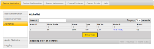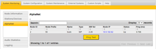 * '''Node number''': Default [[node|node number]] is 1. The node number is used for communication between exchanges connected in a network ([[AlphaNet]]). The node number can be changed from AlphaPro, [[Exchange_%26_System_(AlphaPro)#System|Exchange & System > System menu.]] | *'''Node name''': The name of the exchange, as per entered in AlphaPro, [[Exchange_%26_System_(AlphaPro)#System|Exchange & System > System menu.]] | ||