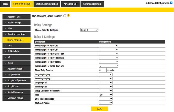 To configure relay operation, select '''SIP Configuration''' > '''Relay/Outputs'''. | To configure relay operation, select '''SIP Configuration''' > '''Relay/Outputs'''. | ||
