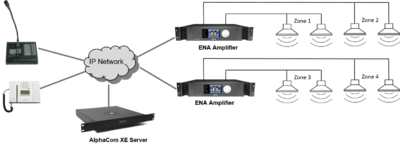 [[File: | [[File:ENA Amp block.png|thumb|400px|AlphaCom Intercom System]] This article describes the configuration required for a Exigo Network Amplifier (ENA) to operate with an '''AlphaCom''' server. The ENA Amplifiers are configured through their web interface. The AlphaCom server is configured using the PC tool [[AlphaPro]]. | ||