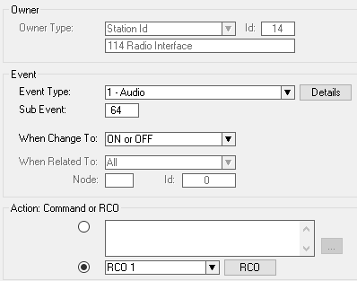 Event Owner: The interface Event type: 1 – Audio Subtype: 64 When change to: ON or OFF Action: RCO 1
