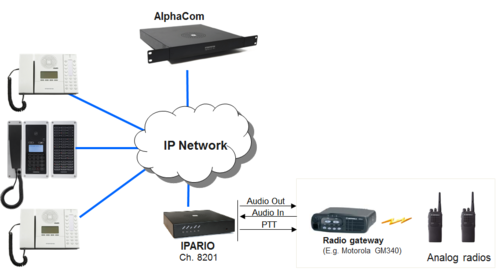 - The IP-ARIO provides signals for audio out, audio in and a contact closure for keying of the radio transmitter. These signals are connected to the mobile radio system.