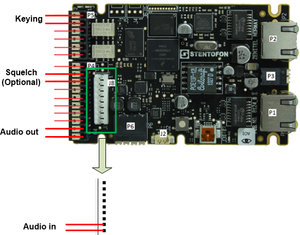 - The FBSAR board provides signals for audio out, audio in and a contact closure for keying of the radio transmitter. These signals are connected to the mobile radio system.