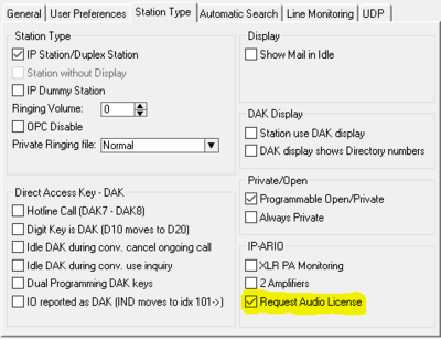 In AlphaPro, Users & Stations window, click the Station Type tab. Under IP-ARIO, enable the Request Audio License flag.