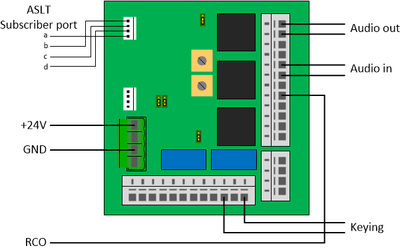 - Towards the AlphaCom the FBSAR board is connected to a free ASLT subscriber port with a-, b-, c- and d-wires. An RCO signal (separate e-wire) is required for the relay operation. For easy installation use relay K2 for keying the transmitter (PTT). The FBSAR must be powered by 24VDC from the exchange.