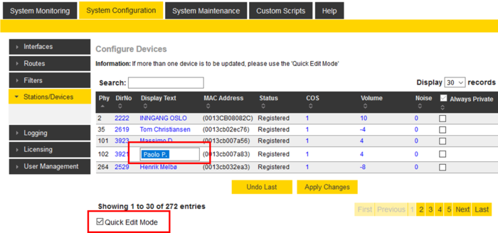 The table can be sorted by clicking on the relevant header. In the Search field you can search for any free text, e.g. directory number, display text or IP address. Click on Download device list to open the station list in Excel spreedsheet.