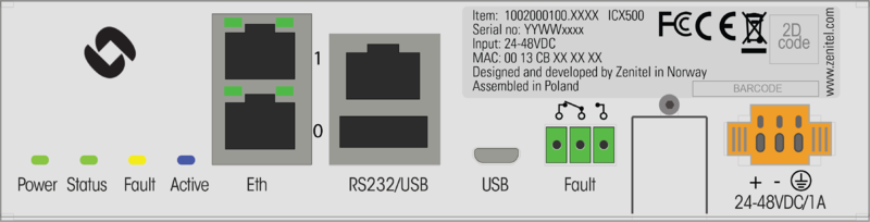 | Factory Default Button | Tact switch | Used for resetting ICX-500 to factory default settings (Behind protection lid) |
