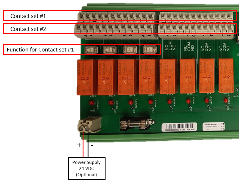 From the left side the outputs are numbered as pin 17 to pin 24. Each output is a dual pole relay with normally open, normally close and common available on the pin header.