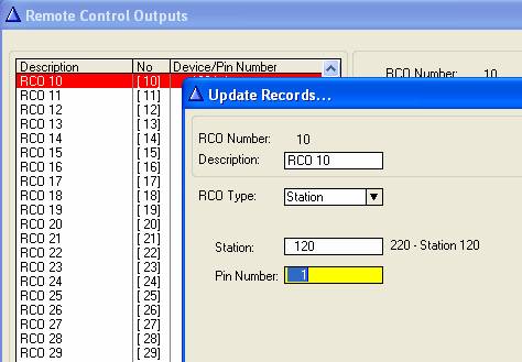 To map a logical RCO to the relay of the IP Station, select Exchange & System -> RCO. Pick a free RCO, select Change and set the RCO Type = Station, enter the physical number of the IP Station, and set pin number = 1. In the example to the right the relay of IP Station 120 is mapped to RCO 10.