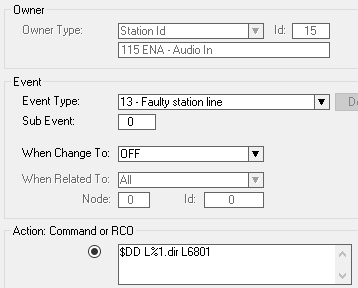 A station/device dialing feature 118 becomes the program feeder. Add an event that sets the Line Input of the ENA Amplifier (or TKIE-2) as audio program source. Use the event 13 (Faulty Station), When Change To = OFF, and action: $DD L%1.dir L6801.
