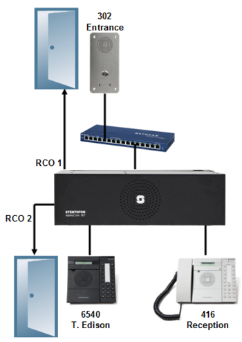 - The station 303 "Gate 3" is located next to the door. By dialing a access code on the station, the associated door magnet (RCO 2) should be activated