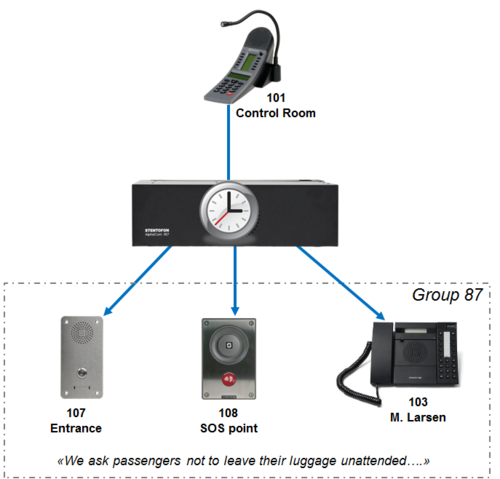 - At 14:15 a prerecorded message "We ask passengers not to leave their luggage unattended..." should be distributed to the stations in group 87.