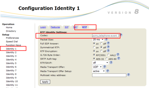 In Identity 1 -> RTP, set the codec to: "pcmu,telephone-event", remove all other codecs: