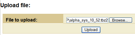 - When the system is up and running again, Browse to the alpha-sys-11.2.3.11.apkg file, and select Upload, then Install.