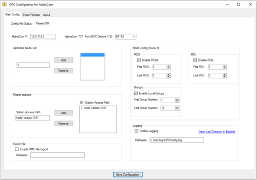 - Node config (optional): If the OPC client should control RCO's or read RCI's in the AlphaCom, the relevant RCO's/RCI's must be defined: