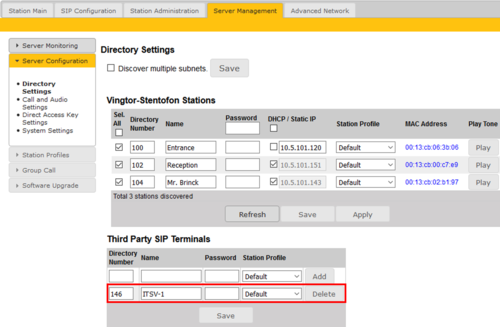 The Directory Number (SIP User ID) and Name of the ITSV-1 must be configured in the AlphaCom Server.