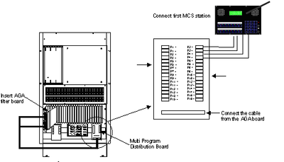 For connection of MCS stations to the AGA board the Multiprogram Connection Board is used, which gives access to all 8 ports of the AGA board. Each AGA board can then be used for 4 MCS stations. Each AGA port distributes the audio from 6 subchannels.