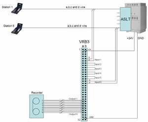 Audio input connections to VRB3 are taken from AlphaCom subscriber ‘b’ and ‘d’ wires. Mixed audio output (per subscriber) is presented on 2 wires.