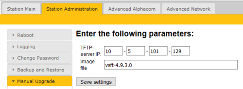4. Enter the image file name, e.g vsft-5.0.3.0, and click Save settings. Wait a few seconds for the page to refresh, then press Upgrade. This process will upgrade the station firmware.