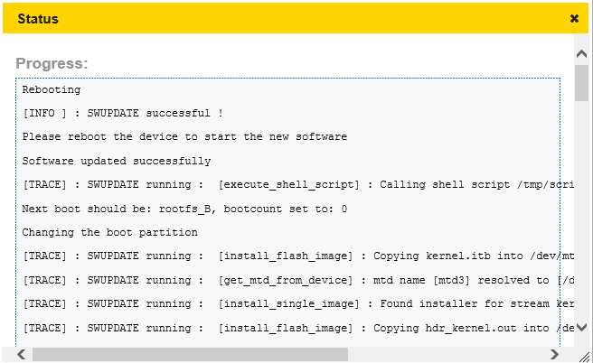The ICX-500 has two memory partitions. When upgrading the software, the partition which is not currently in use will be updated. When the update is finished, the ICX-500 will restart using the updated partition.