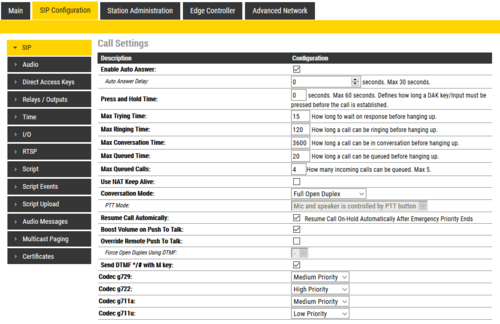 • Remote Controlled Audio Direction: If enabled, received DTMF * will make station listen (microphone off, speaker on), received DTMF # to talk (microphone on, speaker off), DTMF 0 for swich back to open duplex.