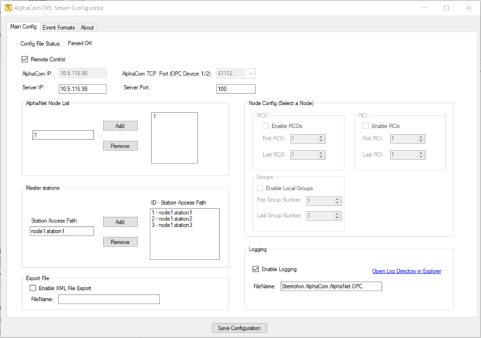 Under the “Main Config” tab the AlphaCom IP address, the AlphaCom node list and optional Master stations are programmed.